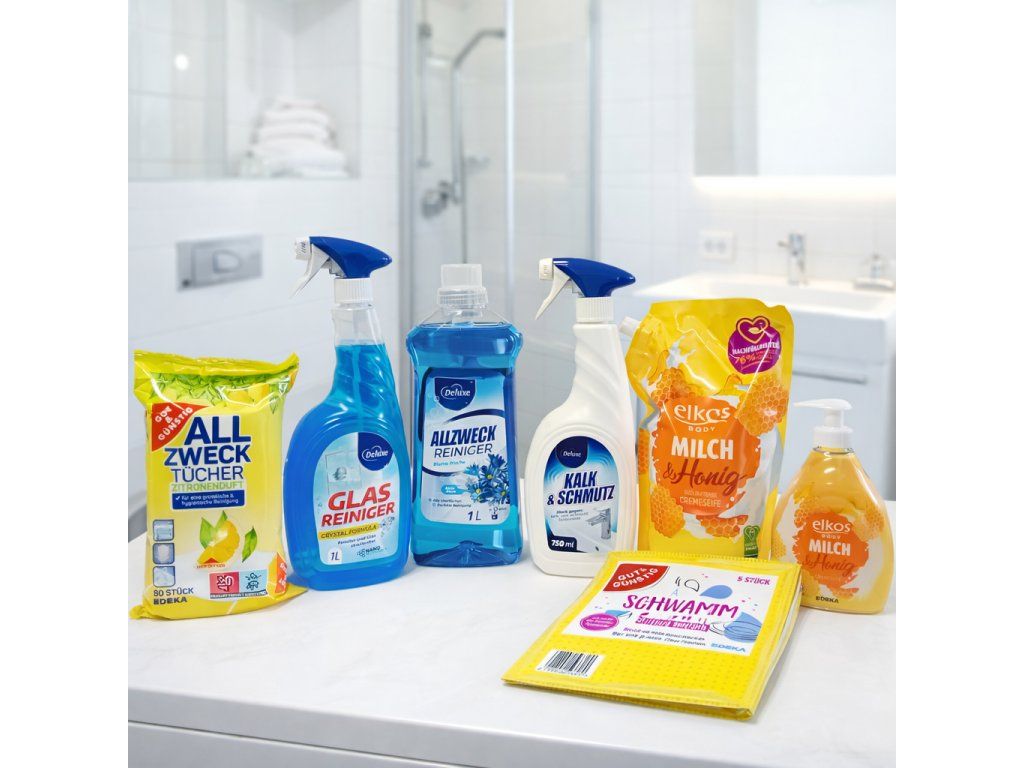 Univerzální čisticí prostředek vhodný pro celou koupelnu – podlahy, obklady i stěny. Účinně odstraňuje nečistoty a zanechává příjemnou dlouhotrvající vůni. - ✔ Deluxe Kalk & Schmutz 750 ml – odvápňovač do koupelny